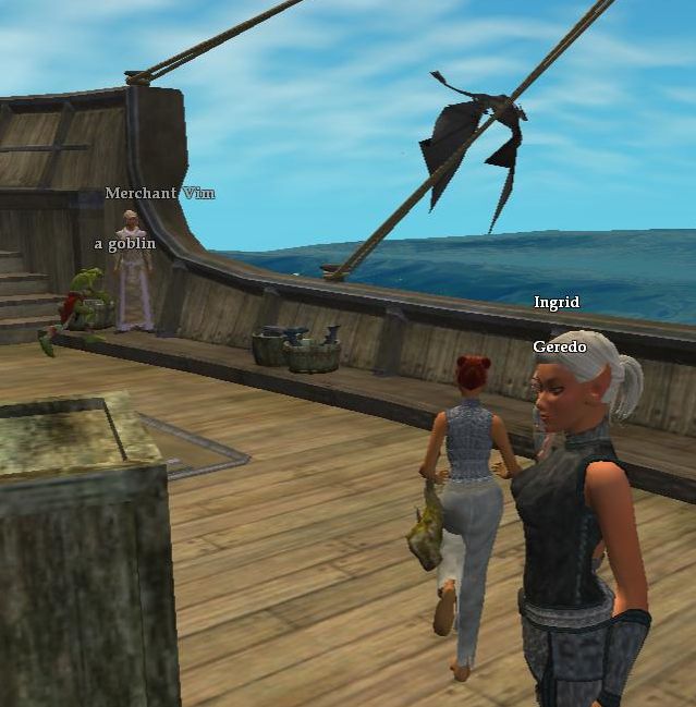 船の上で船員と話をしつつ、頼まれ事をこなしていると いきなり飛竜の襲撃が・・・。 この船は沈んでしまうのだろうか? 檻の中のゴブリンが外に出て商人を襲っている・・・。 とりあえず、商人を助けるのが先決か!? ダッシュで駆け寄っていく。 |