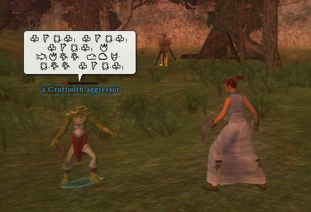 クエストをこなしながら、敵を倒していく。 会話はウィンドウ以外に吹き出しでも表示される。 ただし、未知の言語の場合は、謎な模様が表示されるだけ。 ゴブリン語って習えるんだろうか・・・。 |
