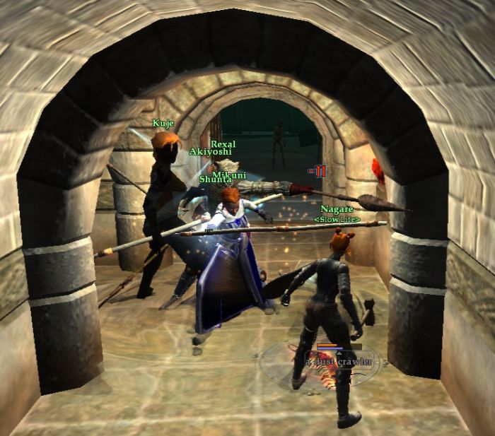 SH の奥、Lv20未満のグループだと結構強敵。 Pullしながら、慎重に奥へ進んで行く。 SK(ShadowKnight) タイプか、たまに強烈な攻撃が。 Woodelfの体力が低い& Heavy揃って無くて AC が低い事が原因。 メンバーの単独行動から Aggroして数回の半壊。 う〜ん、慎重に行こうぜって言ったんだが・・・。 |