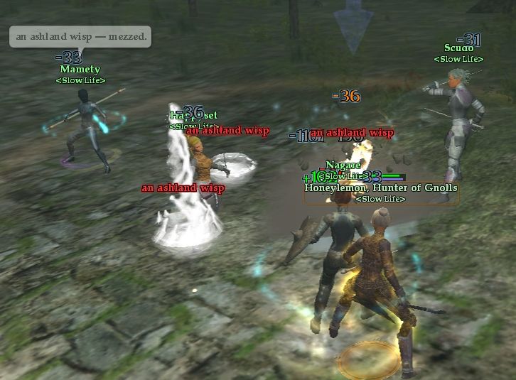 Grater Light Stone という EQ1 に馴染みのアイテム その QuestStarter が Nek の Wisp からドロップすると ガセネタをつかんだ一行は Nektulos Forestへ潜入。 薄暗い森は、道の近くまで Aggroな熊がせり出しとても危険。 Bard MT で無理矢理 Wisp を狩る。 |