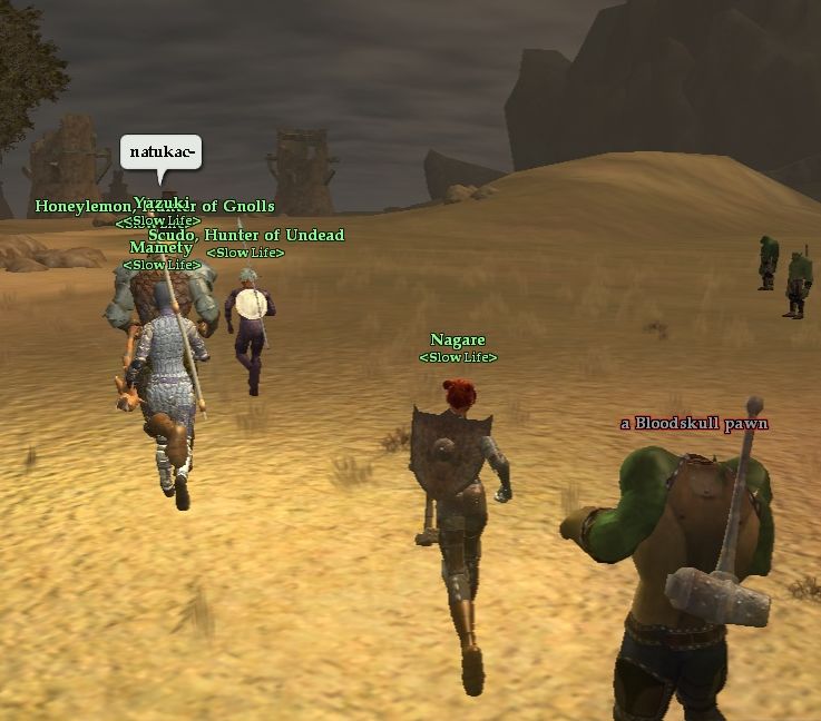 Nek の Wisp じゃないとわかった一行は The Commonlands へ。 EQ1の WestCommon を彷彿とさせる雰囲気で、ゾウやサイが。 そして昔からなじみ深いオークが居ました。 (確かに Qeynos 側は gnoll、FreePort 側は orc だった) Antonica は森林 の雰囲気、Commonlands は荒野の雰囲気がある。 |