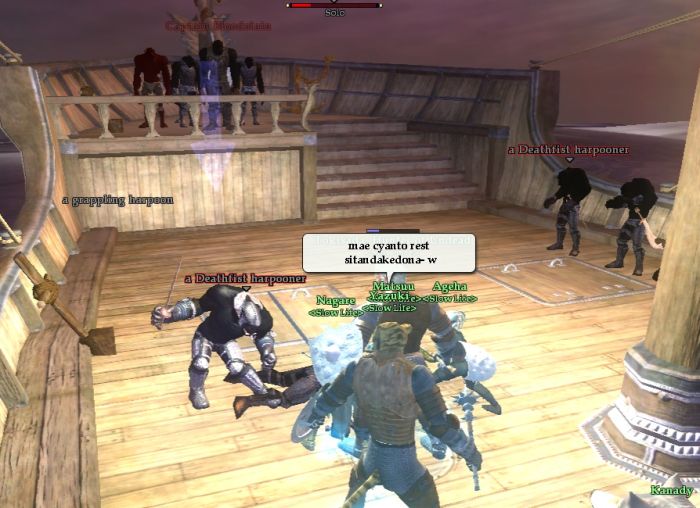 Runnyeye に行った時に、凄い強いグループだったので記録しておく。 メンバーは Paladin, Assassin, Dirge(Bard), Defiler(Shaman), Warden(Druid), Illusionist(Enc) ( 上位職は記憶が違う可能性あり・・・ ) 自分から見て赤のグループも難なく倒せる強さ。 優秀な Bufferで DPSも高そうなBard、Debuffが得意な Defiler、そして Encの Mez。 皆の職が違うので、いろんな Buffが重なる強みもあるだろう。 MT, DPS, Bard, 2Healer, Encという形は、強いグループの 1つの形ではないかな〜と思う。 強力なBuff/Debuffで、最高ダメージの 340dmgも出たし。 ( Assassinは 970dmgとか言ってましたけどねw ) EQ2には必須職は無いと思うけど、Bardは良い職業だと思った。 |