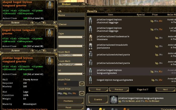 Marketにて買い物、品質毎に性能が異なる。 最高レベルまで使わない事が多いので、ステータス重視で購入。 これは鎧だけでなく全PC生産品に言える事で、 一部のアクセサリは品質の悪い物の方がステータスが良い。 (例えば、Int1, Str3 と Int3, Str2 の場合、前衛なら迷わず前者) これに MobDrop品が加わり、財布と相談しながらの買い物は楽しい。 |