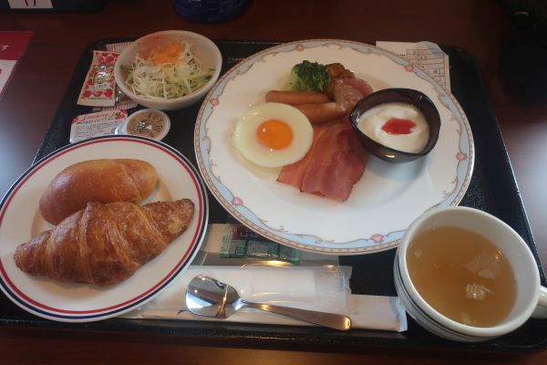 海が荒れると放送があった。 部屋に戻り、iPadで購入しておいた漫画を読みつつ就寝。 --------- 駐輪 :フェリー内 走行距離 79km ---------- 6時過ぎに起床、そこそこ揺れてる。 洗顔とトイレのあと、横になってるのが楽なので二度寝。 揺れが大きいので大浴場を閉鎖するとアナウンスが。 8時半に、レストランの朝営業が残り30分と放送が。 パンの方が軽そうなので、洋食セットにした。