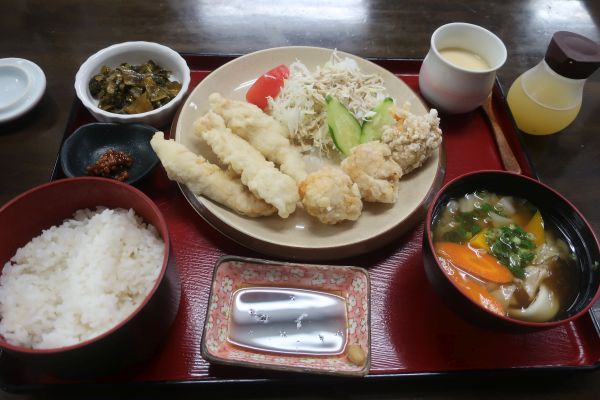 観光客向けの定食で少し悩んだが、唐揚げ&鶏天の定食にした。 雨雲レーダーを見ると逃げ場はなさそうだが、国東半島の東側に出れば逃げれそう。 R213で雨が強くなってきたが、そのまま強行して突き抜けた。