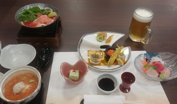 豊後水道に入って揺れが減り、体調も回復してきた。 17時に大浴場開始のアナウンスが。 すぐに行くか30分後に行くか迷うが、すぐの方が空いてるかなと思ったが混んでた。 風呂に入ると調子が戻ってきたので、部屋に戻ってPC作業(仕事)を少し。 18時過ぎにレストランへ。開店すぐで少し混んでる。 何を食べるか迷ったが、1周年記念の豪華定食があったので頼む。 コーヒーをテイクアウトして部屋に戻る。 船にWI-FIが付いてるんだけど、認証ページの最後にPHPエラーが出て繋がらない。 定刻21時に着岸、駐車場へ移動する。