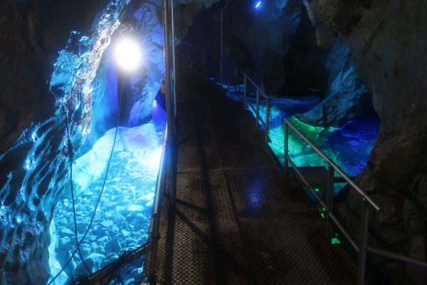 15分ほどで出口へ。 次の鍾乳洞へ移動途中、強い雨が降ってきて高架の下に避難する。 稲積水中鍾乳洞、そこそこ客がいる。 鍾乳洞が地下水で水没したタイプで、水を抜いて展示している。