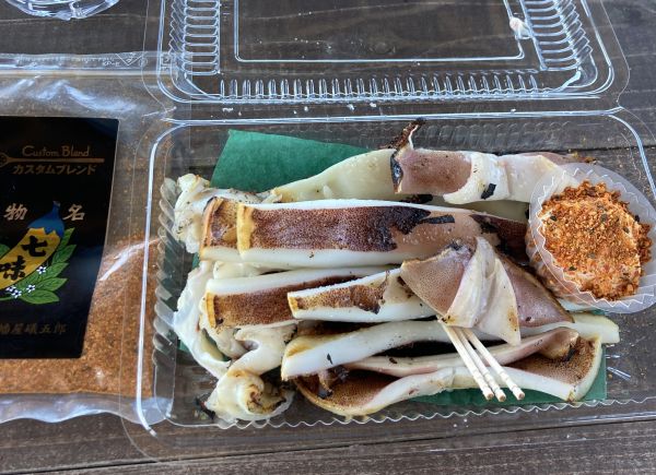 前回は七味が無かった記憶なので、今回は八幡屋礒五郎を持参したけど 暖かい焼きイカに七味マヨ、ああ酒が欲しいぞ。 少し走って道の駅 ふかうらへ。ここのイカ焼きは 1000円だった。 鮭とヒラメとあったが、切れたのか鮭とカジキになってた。 時間がありそうなので、青池にも寄る。