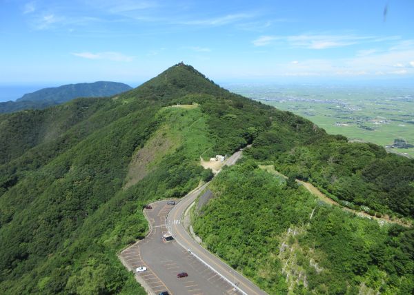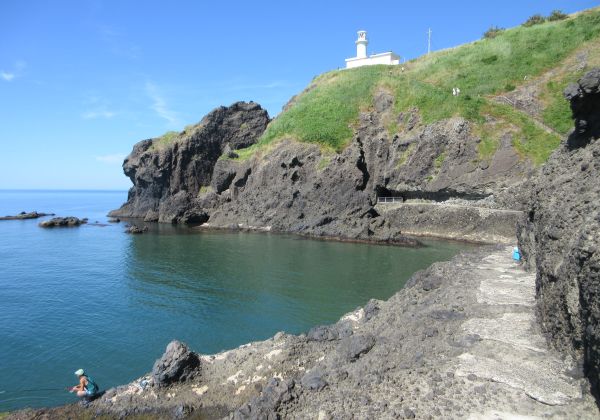 ロープウェイ駅の山頂広場へ移動する。 駐車場に戻って14時半前に出発する、予定通りだ。 夏は海水浴場の駐車場になってて、そこそこ混雑している。 灯台は岩山の上にあって、階段を登る必要があるみたいだ。
