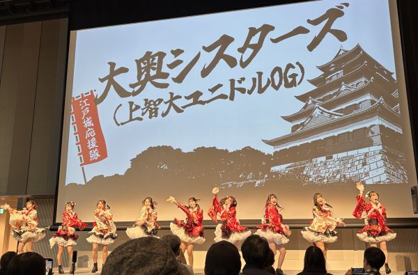 ステージに行くと、中国変面のパフォーマンスをやってた。 次は江戸城天守復活の活動で、忍者風ブレイクダンスと和服アイドルの歌。