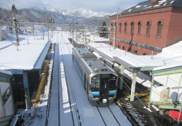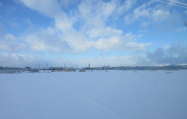 院内駅までは森の中を走ってたが、ここからは狭い平野が広がり雪原が良く見える。