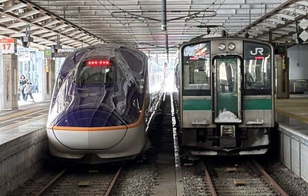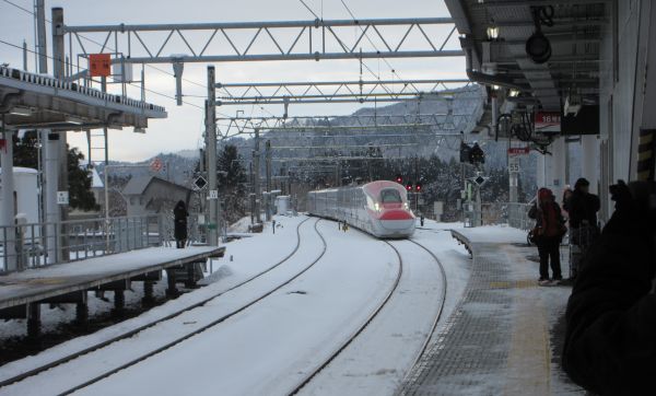 今年の年末年始は帰省しないことに決めて、引籠り(アニメ・ゲーム三昧)のつもりだったが 冬なのでバイクは無し、レンタカーも無し(雪道運転不可)となると電車旅だな。 JREBANK特典のJR東日本 4割引きチケットが2枚ある事に気づき、東北にしようかと考える。 ---------- 5時起床する。睡眠は4~5時間だろうか、少し寝不足だ。 山形新幹線つばさ、6時12分に東京駅を出発する。 とりあえず、新幹線で2度寝する。 米沢で隣の人が降りて、車窓から景色見れる様になった。