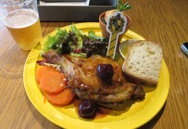 禁じられた森の再現コーナーは暗くて少し涼しい演出。 カフェに到着、ここで一休みって感じ。 ドリンクとスイーツを扱うバタービールバーと、何でもそろうバックロットカフェがありカフェの列に並ぶ。 写真しかないので何で出来てるかよくわからず、見た目で外さなさそうなチキンレッグのプレートにした。