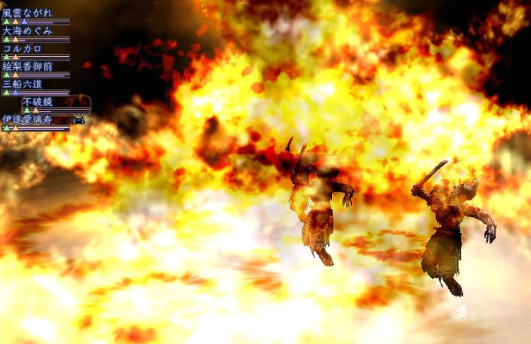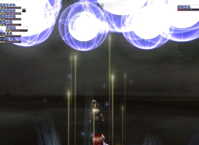 密教僧の新技、紅蓮法輪 派手なニューグラフィック。陰陽師と違って無料です(笑) 侍陰陰僧僧僧薬という変な徒党。 目当ては薬師クエストと御霊。 偽効率徒党で焼き払いながら前進します。 |